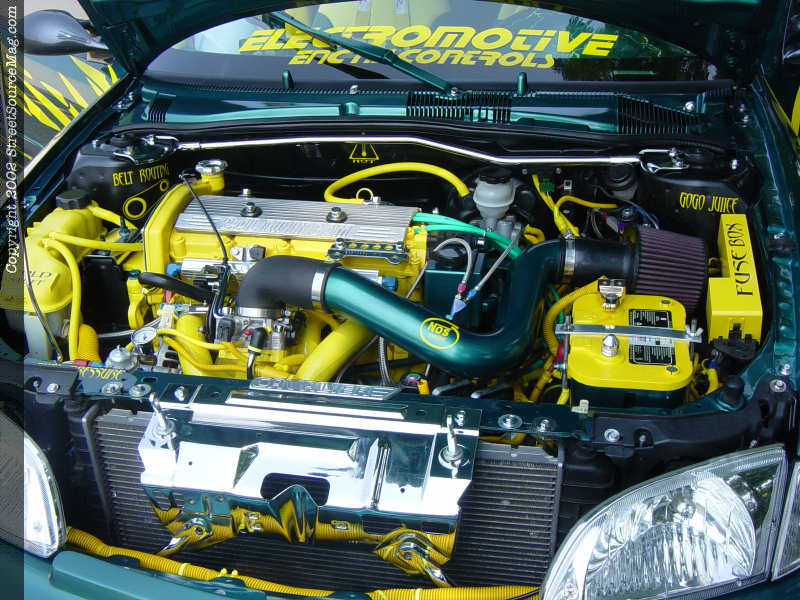 Now that Chris was happy with the look, both inside and out of his car, it was time to give it that extra little power needed to get it going. He knew exactly what he wanted before he even removed the first bolt from his engine. So after gathering all the needed parts it was time to completely tear down this mild mannered Cavalier and make it a full out (street legal) racecar, yet clean enough to still win at shows. The factory 2.4 liter wasn't going to be big enough to handle all the parts Chris had planned for the car so the engine was bumped up to a 2.5 liter. The engine has been ported and polished with JE 9.5 to 1 pistons, HD lifters and MantaPart cams. Chris has also installed under drive pullies and a 180-amp alternator to go along with his new MantaPart timing chain.  To make sure the engine gets enough fuel, a Venom fuel rail and RC Injectors were used. To round out the list of HP goodies, there is an AEM intake on a MantaPart throttle bottle, Electromotive ECU, Holly fuel pump and an AEM fuel pressure regulator. He also chose MantaPart motor mounts so they could handle all the torque the new motor mods would produce.