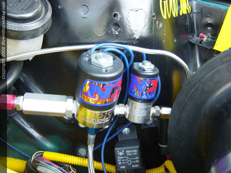 To expel the gasses out of the motor, there is a RK Sport header led to 2.5 inch tubing and an Apex 1 M1 muffler. Now that Chris has the motor strong enough to handle anything, it was time to hook up his full nitrous system from Nitrous Express. This system is a 50 shot complete with a purge and a bottle warmer to make sure the gas will be ready when he chooses spray the motor.