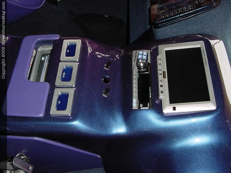 No custom vehicle is complete without a stereo to let everyone know that you're coming, so Chris dropped his van off to Audiovision in Houston, Texas for a complete audio/video experience. An Alpine 7893 head unit send signals through the Alpine EQ, where sound is distributed equally to the Audiobahn component set and three 18" Audiobahn subs. The mids and highs get their power from two Audiobahn HCQ2140 amps, while the massive subs receive juice from two HCQ2300 amplifiers. Simply having sounds isn't enough these days, so Chris also had five 7" tv screens installed throughout the cab, as well as a Playstation 2 and Dreamcast.
