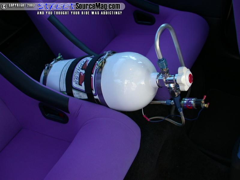 The only thing left for Jack would be some engine work to back up the aggressive stance. To manage that a set of AEM and UR pulley's, AEM intake, RK Sport upper and lower engine mounts would all be installed. Next a wet 50 shot of Nitrous Express would be installed along with a RK Sport header with 2 ½ diameter hi flow Magnaflow exhaust and Ractive muffler. A blue hose kit would be installed to help with show points when the hood is up.