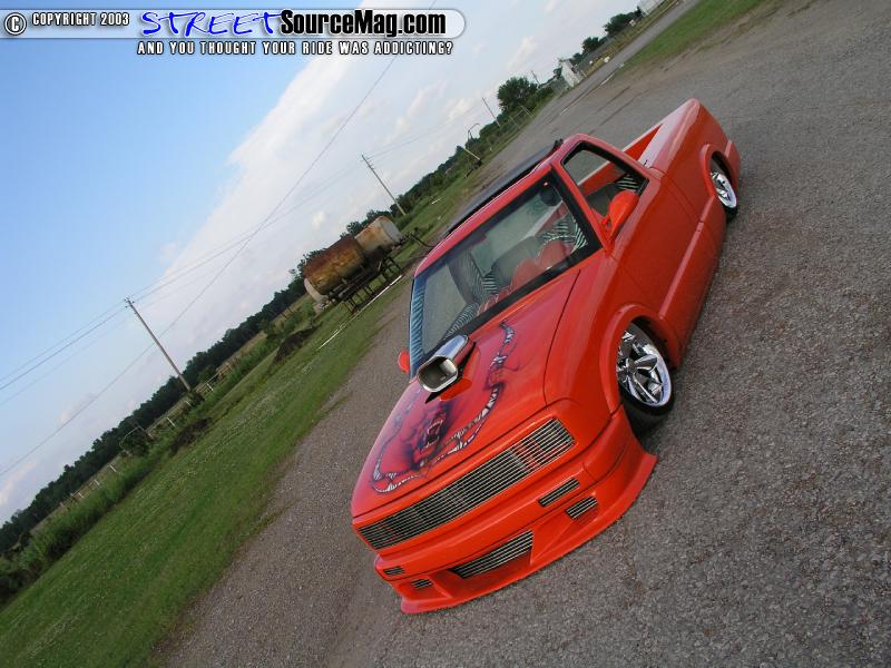 Dustin picked up his 94 Chevy S-10 for a mere $1500.00 back in 1999. After taking ownership Dustin knew that this was not going to be another average truck so he decided to go all out and start big. The first order of business was to set the frame on the ground. Dustin first ditched the factory front coils in favor of a Firestone airspring mated with a BellTech 2" lowering spindle to set the front crossmember flat on the ground.
