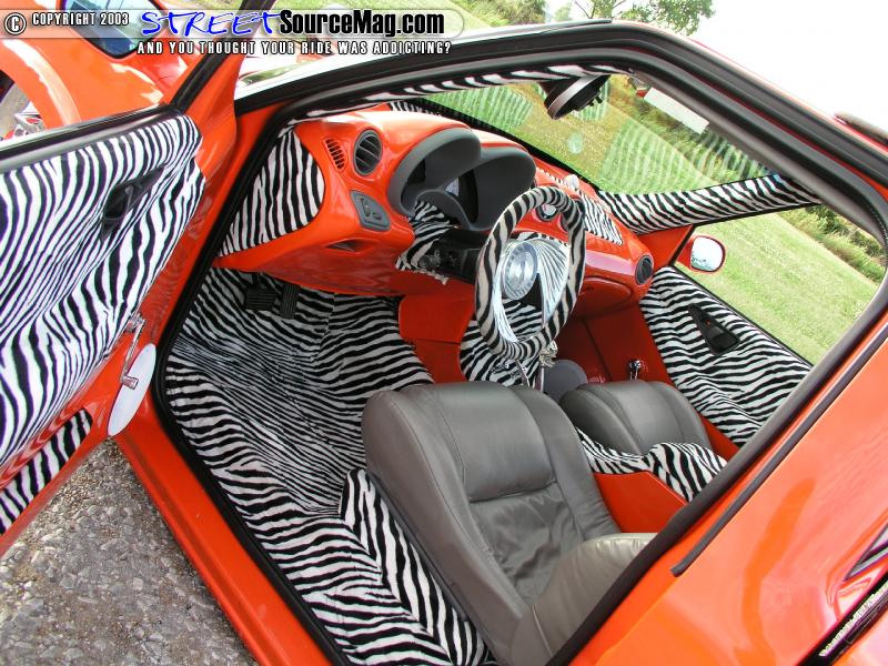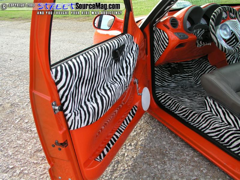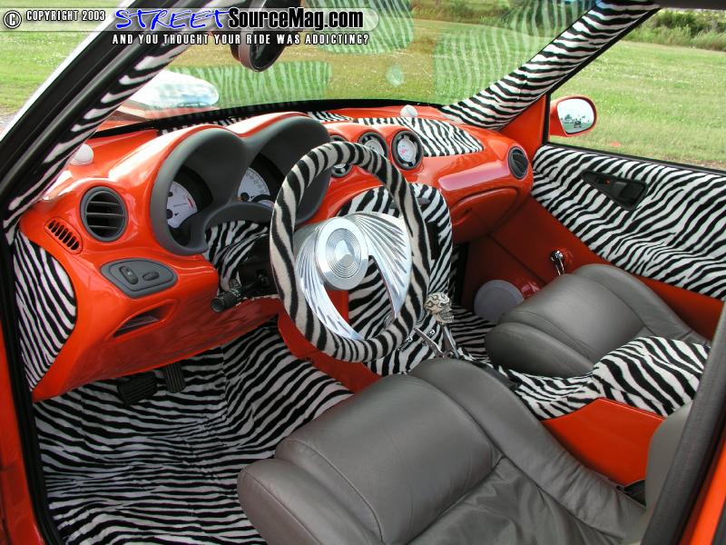 and other items were treated with more Zebra print then the local zoo could provide. Ok so no zebra's were actually killed to supply the material so we lied. For seating arrangements Dustin had a seat of Fiero buckets cut down and rewrapped in Grey Italian Leather. Ok so maybe it wasn't Italian leather but it looks good though.
