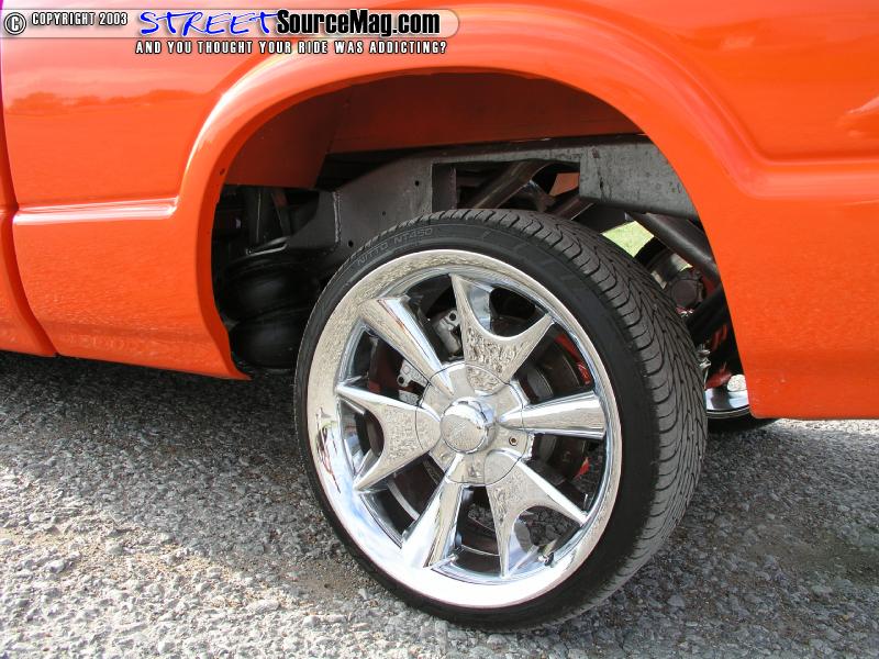 Now that Dustin had everything meticulously back into place it was time for some Bling-Bling, so Dustin decided on 18" Y2K Edge chrome rollers wrapped in 215/30/18 Nitto skins. So what's next I mean the truck has one helluva built motor, it now sports a body dragging stance and to boot it's got more Zebra print then the local zoo, Cause he killed em' all to build his truck, OK OK I'm just kidding about the dead zebra's. Well show it DUH!!!!!! Dustin is not scared to take his truck anywhere at anytime. I've personally seen this truck at shows all over and after giving me the run around for a YEAR Dustin finally gave me the privilege of shooting it for SSM at Greenville this year. The LOVELY C.J. is once again our model of choice.