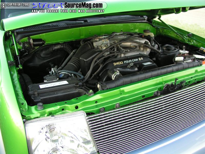 Next Kevin took a set of wire cutters and decided to relocate EVERYTHING under the hood that was in the way. Kevin then added a set of gas shocks to hold the hood up instead of the prop rod design that came with the Taco. All of this to allow the engine compartment to host a clean look.