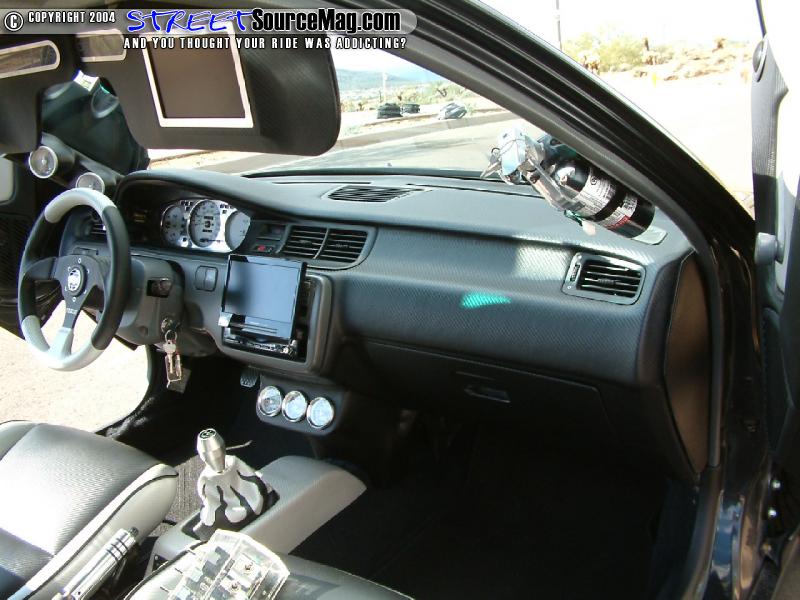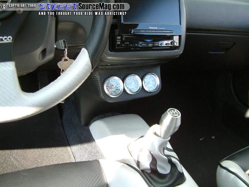 Greddy, reverse indiglo gauges would replace the stock gauges while a set of Integra GSR seats stitched with flames would replace the stock seats.   A Sparco steering wheel and Trenz flamed billet mirror would help the accessories while a chrome roll cage and Sparco 4 point harness are installed for safety. The center console would then be housed with a custom gauge pod housing Greddy gauges.