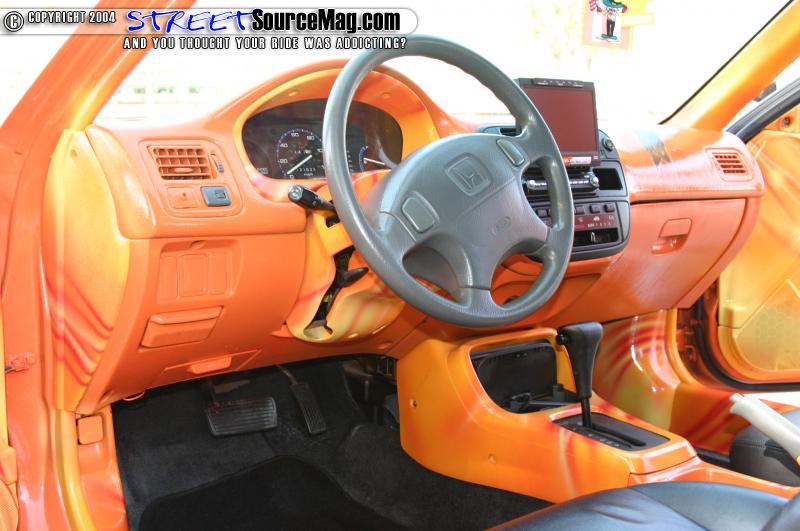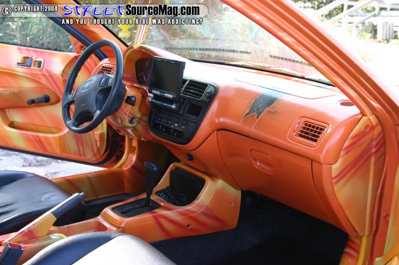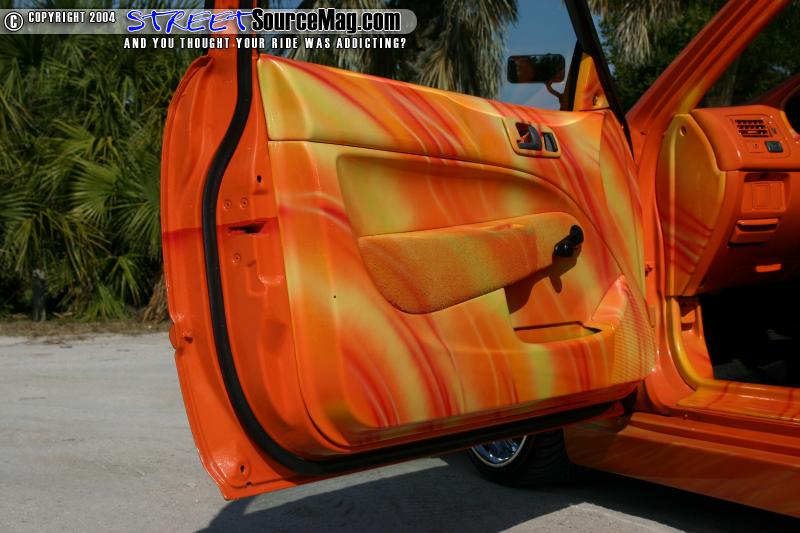 Inside the car Jose fabricated new seat rails and installed a set of Toyota Celica seats in the front. In the rear of the car Jose fit the rear seats of a Toyota Celica as well. The seats were all wrapped in leather. The inside of the car mirrors the exterior of the car with more graphics. Jose then installed a Jensen CD player.