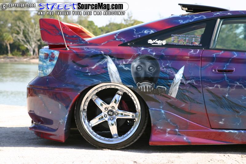 With the clean look he wanted accomplished Jose called up Fred Shutrump of www.fireballgraphicsbyfred.com to come up with a graphic design for his Celica. Because Fred was into painting cartoon/comic style graphics he sprayed Jose’s Celica with Hell boy graphics, flames, and slim.