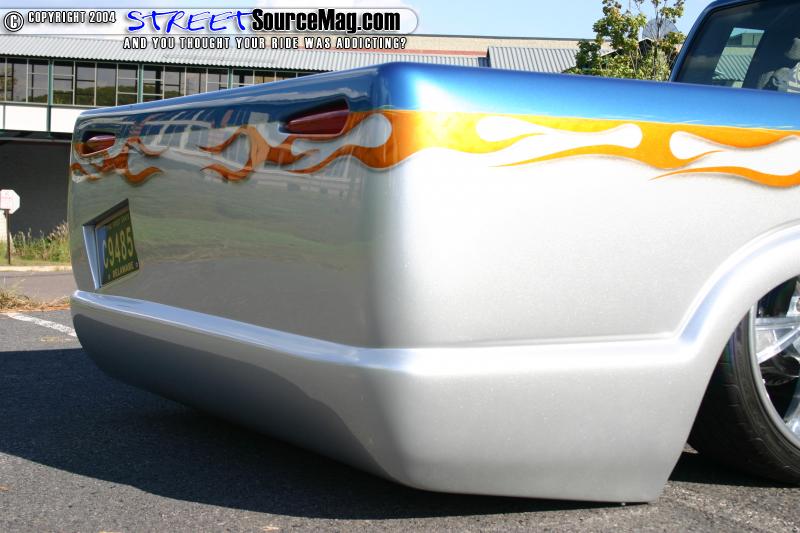 Next Ryan and Shawn brain stormed and came up with a few ideas for the exterior of his truck. First the door handles, antenna, tail lights, 3rd brake light, gas filler door, and rain gutters were all shaved off. The third brake light was replaced by a LED light bar, and the roof was fitted with s rag top.