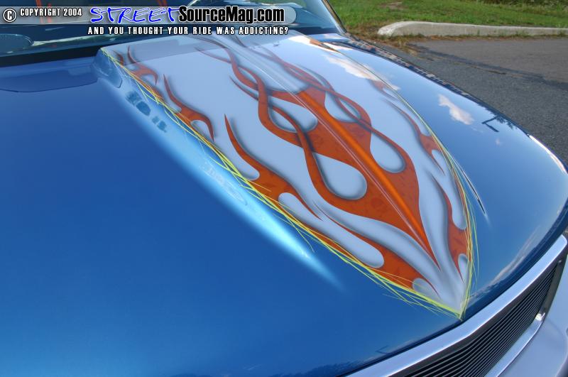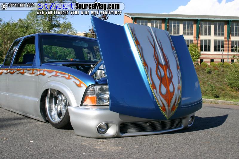 Up front sits a suicide cowl hood, and an Envoy front end conversion. Out back the bed exterior of the bed was smoothed and a custom set of tail lights was installed. Inside the bed the coverers were radiused and the bed was smoothed all the way around.