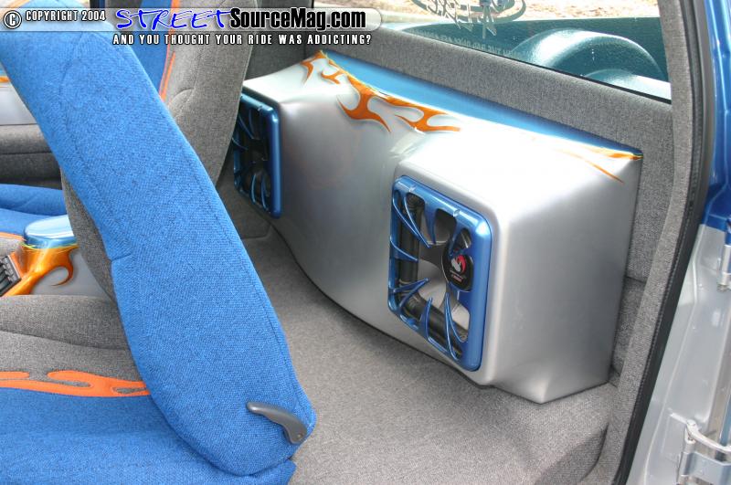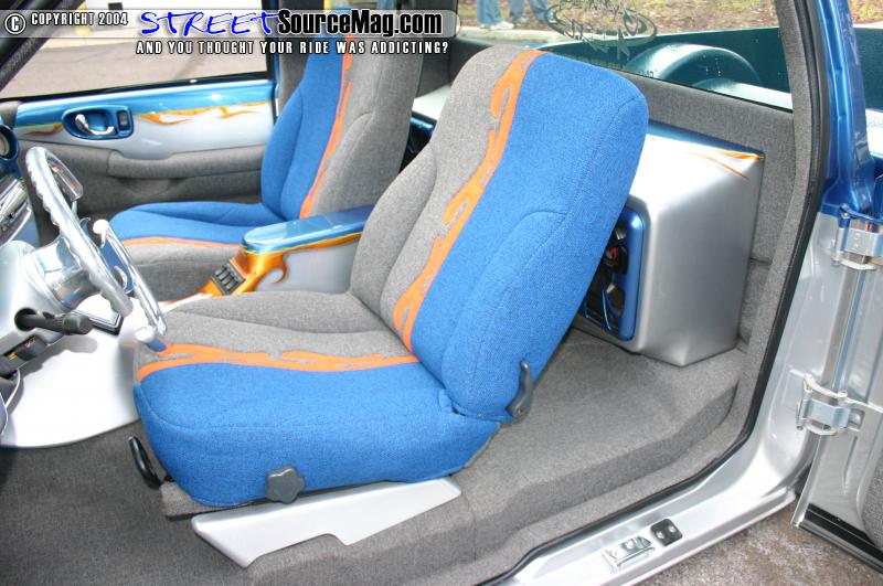 The headliner was wrapped in tweed and the seats were wrapped in blue tweed and grey and orange graphics to match the exterior paint job by Strader’s Upholstery of Milford, DE. Joe’s Car Stereo wired up the Alpine CD player, MS Quart interior speakers, and Kicker Solo baric subs.