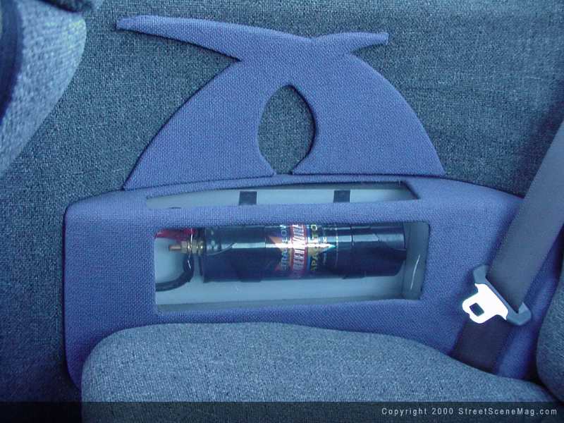 To utilize the monitors, Adam decided to install many components such as a Sony Playstation and a Panasonic VCR. To help provide the sound would be an Alpine silver swing CD player. Using 3 Alpine amps to supply power to the Dynoaudio mids and tweets along with a few Polk Audio 12-inch subs. When you glance into the rear of the Civic you can see Street Wires capacitor covered in Plexiglas in the rear armrest. Adam himself wired all of the audio and visual components.
