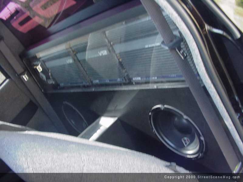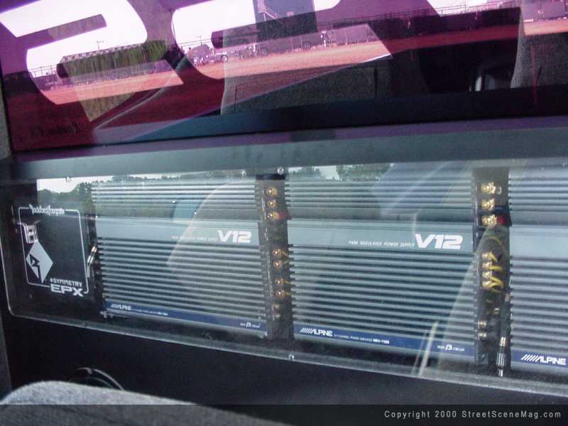 Using Formica as a coating along with a Plexiglas face to cover the amps the box was coming together nicely. He then went to the console, which enclosed all of the relays and feet of wire. This is the location were he would place the switches, fuse block and capacitor. The next step would be to install the T.V. and VCR into the custom console. Scott had the Alpine CDM 7835 CD player installed and molded into the headliner. Now to bring out the sound, 6 ½ Mids and 4x6 plates were installed for the highs, and 10” OZ’s were installed to bring out the bass.