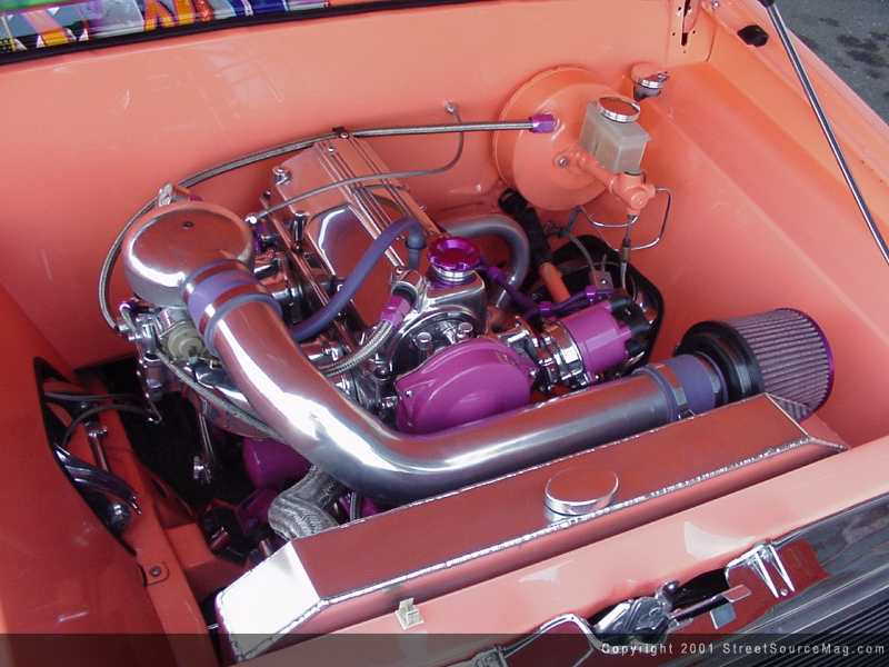 Knowing that this would not be a daily driven ride, the stock 2.0 4cyl would under go more eye candy modifications then performance. One of the few actual engine upgrades would be Delta cams utilizing 260 duration and 410 lift. The water pump would be polished and the engine pulleys would all be chrome plated.  An electric dual Flexalite cooling fan would be installed to help clean things up along with polished valve covers. With a 3-angle valve job, Chris also decided a polished Weber carburetor would be a necessity.