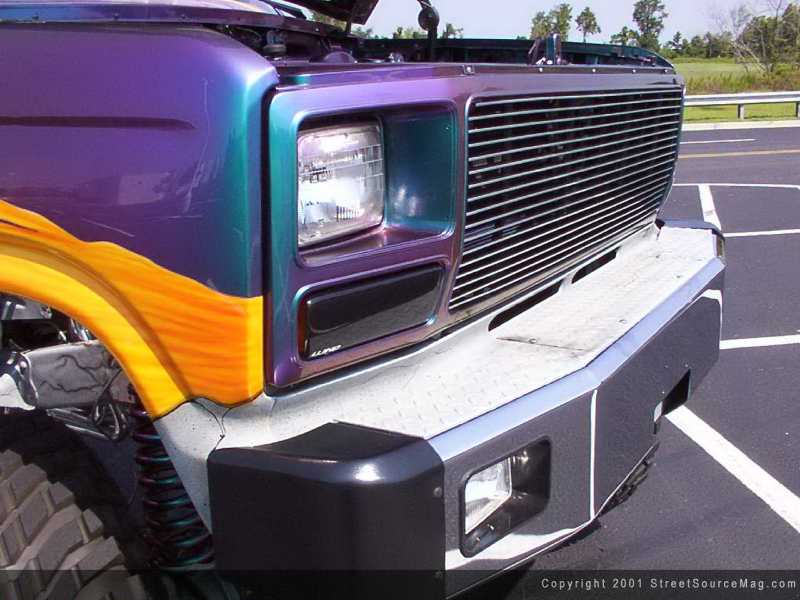Starting with the body of this truck, Johnny has shaved, filled or molded just about every part possible. The front bumper has been swapped with a chrome Warn Winch model and a billet insert has been added to the grill to give the front of the truck a more aggressive look.  From there the cowl has been shaved and smoothed of everything except the driver side wiper. The next thing you notice is that the door handles have been welded shut and an antenna has been frenched into the passenger side rear cab corner.