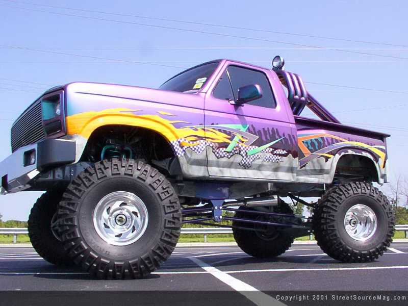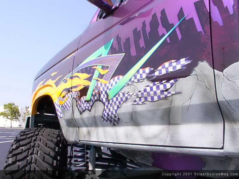 The gas filler door was shaved as well as the entire gas tank and filler tubing to make room for the aluminum 10-gallon tank to be mounted behind the cab between the frame rails. At the rear of the bed, the taillights were shaved as well as the rear bumper and a set of billet taillights were mounted under the tailgate which was also smoothed to match the front of the bed and the rear of the cab.  Now that Johnny was happy with the bodywork that was done to his 4x4, it was time to pick a color that would stand out on the truck. Since he couldn't decide on just one color, Dupont Chromalusion was chosen as the base color. This gave Johnny a few different color flips of its own, but he still wasn't happy with that. The bottom of the truck was sprayed with a gray base then airbrushed to give the illusion of cracked rock. Coming off the front of the truck is a set of orange and yellow flames that extend all the way to the middle of the doors.