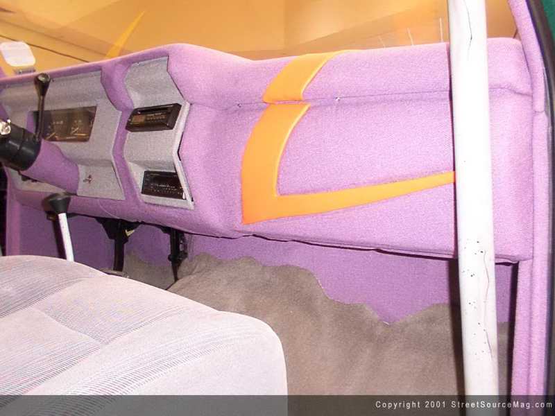 Now that the exterior has been completed, it was time to build an interior that could hang with the amount of detail put into the body of this truck. The factory seats were removed and a set of '97 Ford F-150 Extended Cab power seats were bolted in. The dash, door panels, headliner and back of cab were wrapped with purple and gray tweed with multi color vinyl graphics throughout the interior.