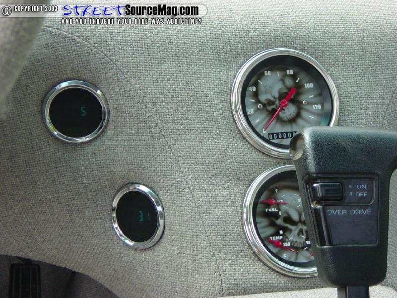The first thing Stitch had to do was to build a custom dash. Loosing all the heat and air controls and vents cleaned up plenty of room to make a deep slope to the new dash. The CD player was moved to the headliner in a custom mount.   All of the factory gauges were also scrapped in favor of a couple custom painted and relabeled gauges from Classic Instruments. The gauges have the same graphics as the frame.