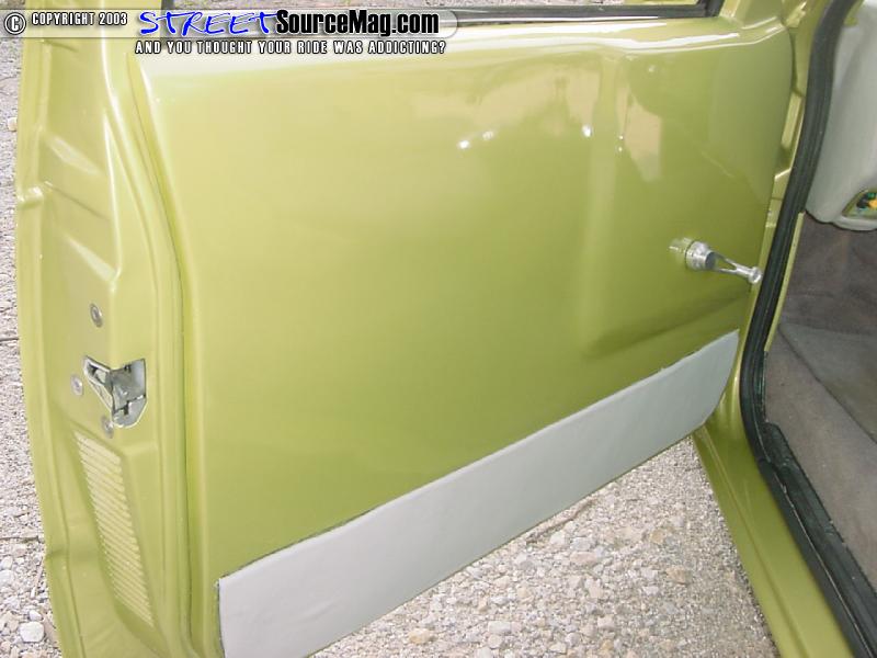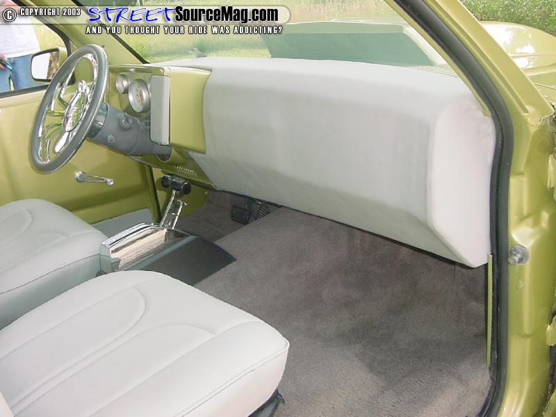 As for the door panels Rusty smoothed them and had Kyle Jones paint them and all the other plastic interior pieces with the same Sublime Green to match the exterior.  The chopped blazer seats where rapped by Roy's upholstery and fit into place. To finish up the interior Rusty added a B.A.D. steering wheel and a B&M floor shifter.
