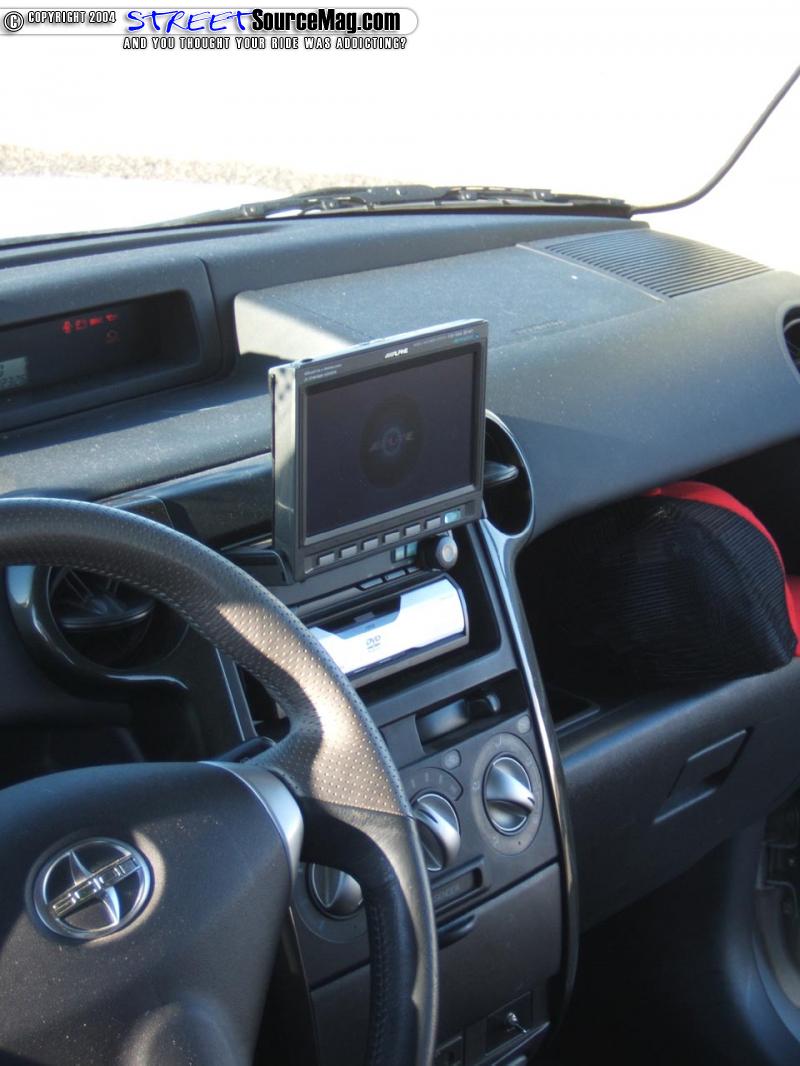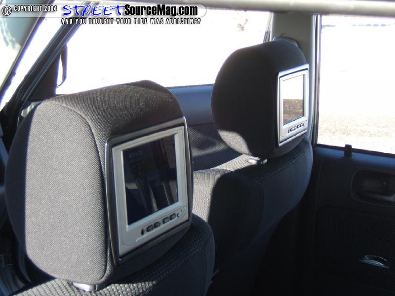 Looking inside the box, more paint is found about, like the airbrushed headliner, dash trim, and console trim which were all painted by your favorite painter, James Cashman. Fender Bender Intl. also whipped up a set of custom billet pedals, for a little bit of Scion love. Phil then added some accent lighting under the seats, dash, and speaker grills. The heart of Phil’s interior modifications is his killer mobile entertainment system, which starts off with a Alpine 6.5 in head unit with DVD player, which mans the two 5.6 headrest monitors. Crystal separates are mounted in the doors and in the dash for all those high notes. A JL 12w3 is mounted behind the rear seats in a custom fiberglass enclosure along with the JL amplifers, which power it.