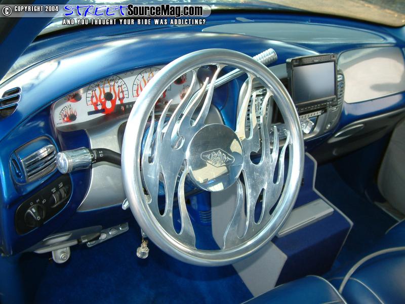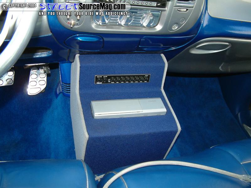 Needing the ability to change out CD’s without looking through a case Robert would then install a Clarion 6 disc changer into a custom center console warped in silver and blue tweed. Two 7-inch monitors would then be installed into the sun visors while a 10.4 flip down would be mounted facing the rear for those tailgaters on the Cali.
