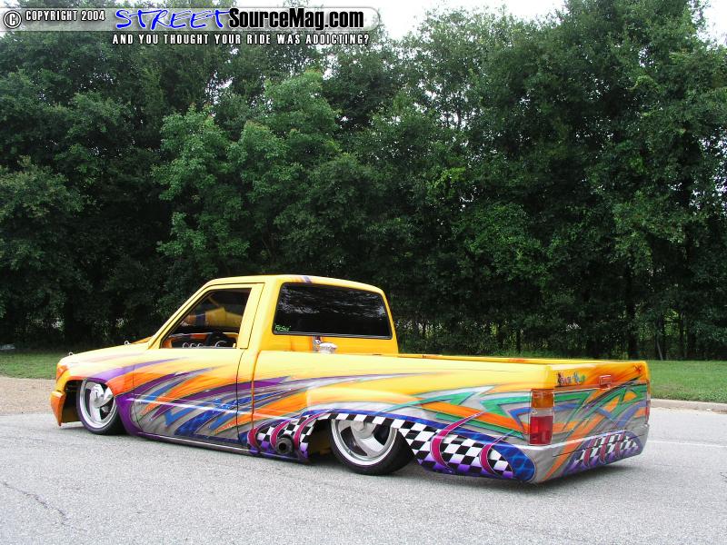 Dion Giuliano of Kal Koncepts was the original owner of this 1986 Toyota truck that started life as a beat to hell shop truck that was simple ready for the crusher. After being salvaged from a butcher shop that unsuccessfully tried a bodydrop, Dion Giuliano brought in Shaun Carlson to finish the drop, and set up the airbags. The airbag system in this mini was the first one shown in a step-by-step in Mini-truckin magazine back in 1995.