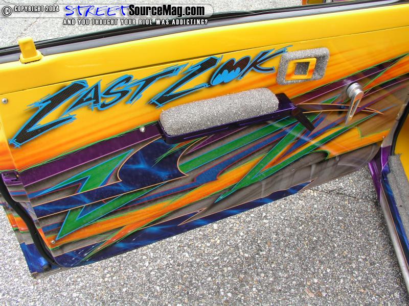 The interior was finished with a handbuilt rollcage. The flooring, dash, and all interior panels were finished up with molded carbon fiber panels. Notice the clean floor mods done for the bodydrop. The entire underside was skinned in aluminum that was later painted to match the exterior graphics.