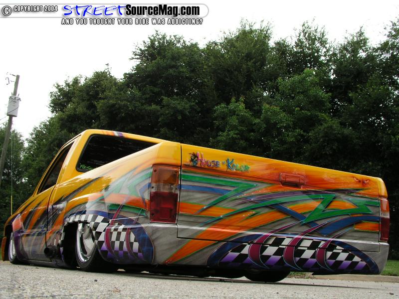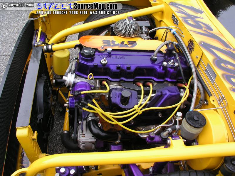 The engine cage extends throughout the firewall, and joins the frame. Notice the handmade brackets that replace the need for a core support. The front end was to look like a race ready spec truck. This truck was built when the first Nastrucks were appearing at exhibitions, they wanted the mini to look the same way. Notice the carbon fiber valance below the window.
