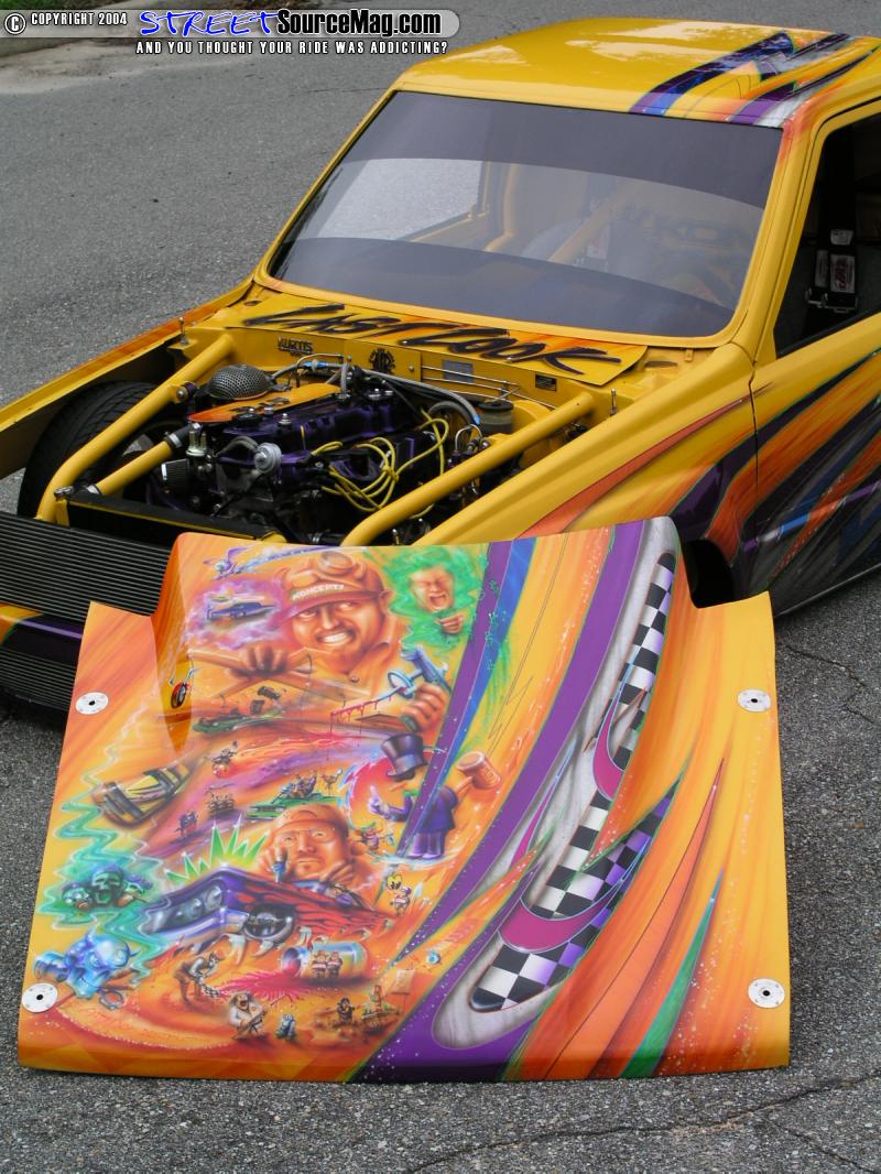 Of course what is a kustom without a mural. Murals in the mid 90's were slowly relegating themselves more to lowriders. The Last Look brought the mural back into consideration on minis. Still not a standard, when done right, murals always increase the interest factor of any kustom. Especially when they tell a story. This hood told the story of the truck, and Kal Koncepts throughout the early 90's. To put it simply,...a lot of people loved the hood,...and a select few didn't. Perhaps because they were on it!, Hey, they are kustom painters,..not role models. When I talked to Dion and told him that SSM had shot Last Look for a feature I could tell he was just as proud today of his creation as he was 10 years ago when he tore the truck scene a new one with a truck that still hold the mini truck scene to a standard few have since reached.