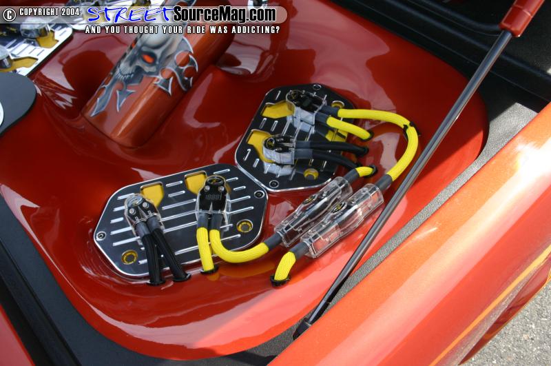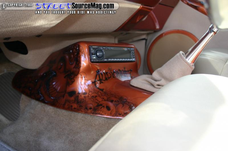 The interior of Bobby’s truck was all smoothed and glassed. The interior also features HOK painted parts with custom graphics. Bobby’s interior features everything from a custom stereo, chrome fire extinguishers, billet steering wheel, to custom wrapped seats.