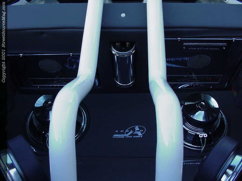 To accompany the custom interior now at hand, Darron took it upon himself to install a bad ass stereo to tie the entire interior together. Starting with an in-dash Pioneer Premier head-unit along with a Cadence EQ,, the tunes would be provided throughout. Next, Darron built his amp rack, which houses three chrome Audiobahn 2600 2-channel amplifiers and 1 chrome Audiobahn 2400 2-channel amplifier. Not only housing the amplifiers, the rack also displays the chrome Audiobahn Acap1 farad caps.