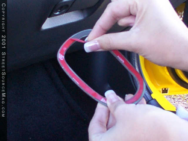 After cleaning the part of the dash to receive the kit, pill the backing off the 3M tape that holds the piece to the dash. Start with one side of the piece you are working with and gently press it to make sure it is lined up. Once you're sure its in place, go back over it with firm, solid pressure. With pieces that are to be bent around edges, work the piece from left to right to keep the piece from bunching in the middle.