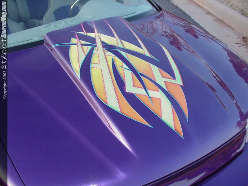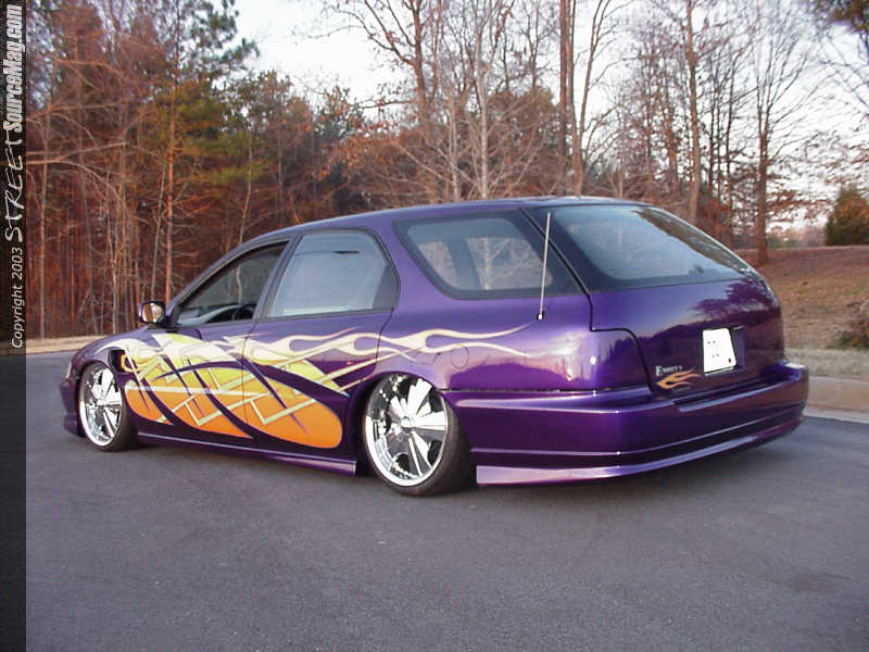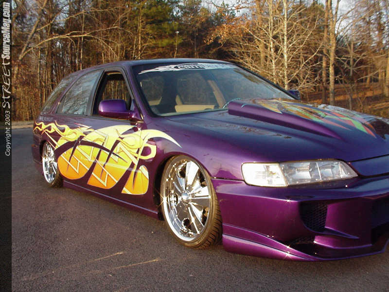 Embrey's was now ready to perform a few custom modifications that would set Michael's Accord apart from the rest. To do this, they first ditched the factory hood and replaced it with a custom cut and molded fullsize Chevy cowl induction hood.  The fenders were also custom fit using TransAm fenders, complete with the T/A vent. Embrey's also installed a Wings West Aggressor front bumper and Wings West lip kit in the rear. After replacing the factory headlights with H.I.D. units, Embrey's prepped the Accord and then moved it into the paint booth to work some exterior color magic.