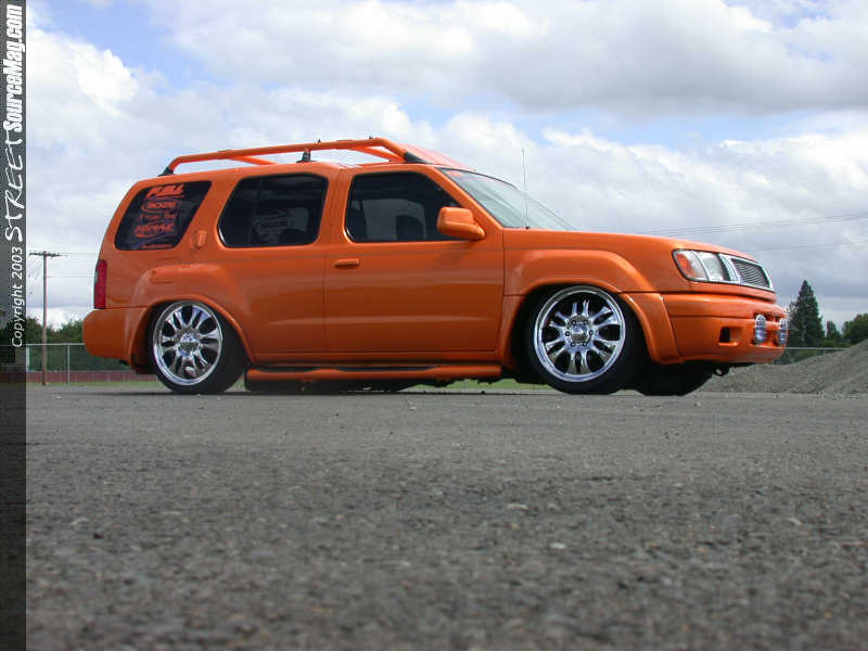 With the main visuals complete it was time to bring the Xterra down to proper height. For starters the rear frame rails would be reworked by Nathan insuring that there would be enough travel at lower levels while the front was notched slightly for the Boze Fusions 20x8 ½ wrapped in 255/35/20's. Next Nathan would build a custom 4-link along with a custom pan hard bar to help bring the rear down with the ½ inch port 2600lb bags from AIM.