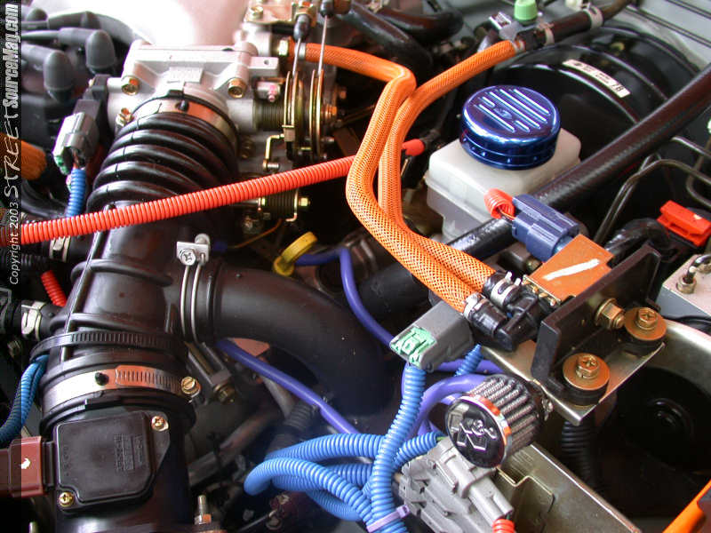 Nearly complete the engine was last on the long list of must do's. For starters a Stillen Intake, STR carbon fiber and polished dress up pieces along with orange and blue silicon hoses and wire covers would be installed. Next Nathan would install a 2-½ inch Gibson tri-flow cat witch dumps off before the rear axle, which had been custom bent. Finishing things off, the ignition system is computer chipped and the vehicle is traced by GPS for the alarm system, not a bad touch for this spendy completion.