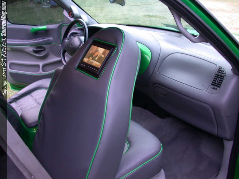 With long trips to shows around the west, the sounds and video would be next on the list. The Stock 6 disc CD player/stereo would be painted to match the interior will an 8-inch sub would be installed into the side panel with Rockford Fosgate amplifiers to push the system. With the stereo installed it was time to install the 7-inch wide screens into the headrests finishing things off. CJ himself did the wiring of the stereo and video.