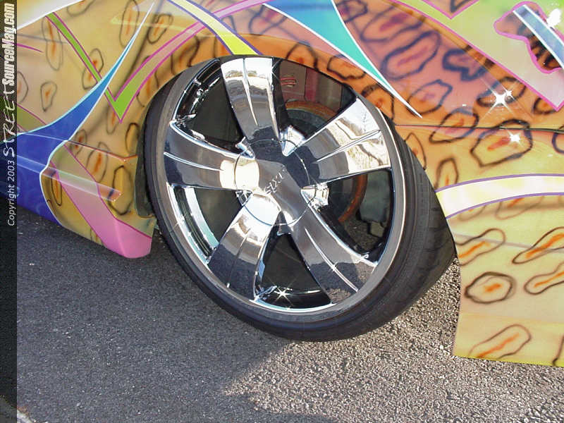 The seats were first re-stitched, complete withcheetah accents. The floor and kick panels were thenrewrapped using tan and cream suede. The rear hatchalso received a makeover, as the panels were wrapped in matching tan and cream suede.  The dash panels were also color matched to the outside of the car, receiving paint and graphics. One can also find billet window cranks.