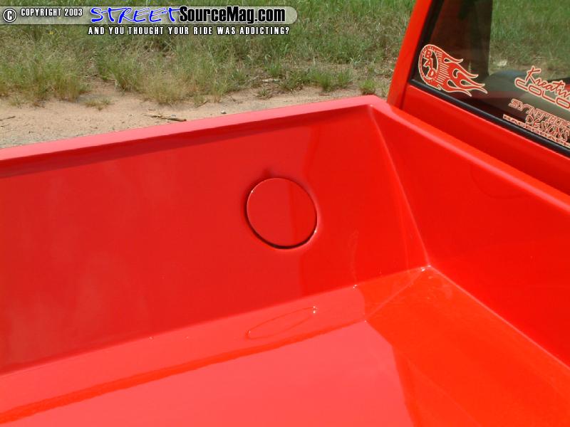 The gas filler door would also be shaved and relocated into the bed, which had been completely sheet metaled, molded and smoothed to perfection. Finishing off the body mods, the tailgate and roll pan in the rear would be molded to the bed while the wiper cowl and antenna would be shaved. Insane Designs and Kreative Colors of Texas would redo a lot of the bodywork.