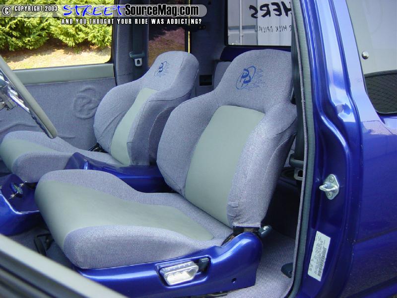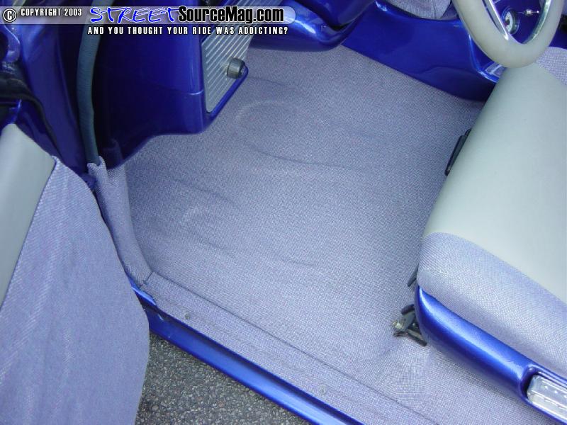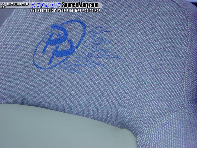 Now that the outside was something that would catch everyone's eye, it was time to completely redo the interior. The factory seat was taken out in favor of some out of a Honda Prelude, but not before they were reshaped and rewrapped in lilac tweed and gray all ante.   Bubba even had the Pebble Pusher logo stitched into the headrest. The door panels were shaved of all extrusions (arm rests, window cranks, door handles) to smooth it out.