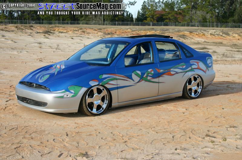 Metal Magik decided it was time to rid the Focus of its door handles, stock tail lights, head lights, mirrors, moldings, antenna, and change it up a little bit. The rear doors where fitted with a set of suicide door brackets while the front doors remain stock to give it the look Stevie wanted. In place of the stock taillights, Metal Magik molded some Supra Tails in the trunk lid to make the rear end of Stevie’s Focus stand out.