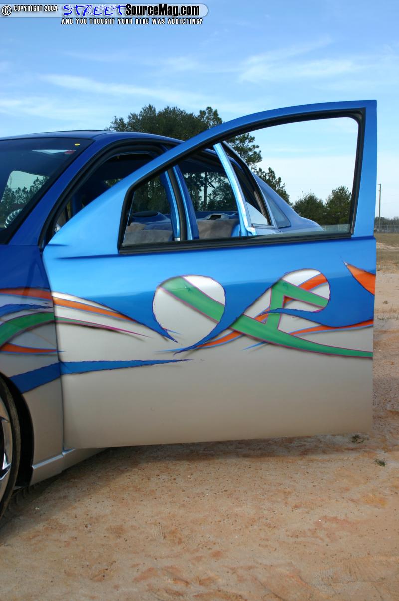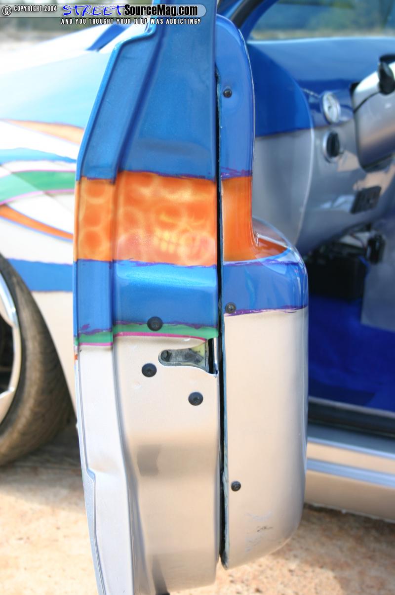 House of Colors orange, green, purple, baby blue, and green are the colors that make up the graphics. Inside the baby blue graphics are money symbols and orange skulls are painted in the jambs. A thick layer of clear would be applied next to give the paint the mirrored shine it needed.