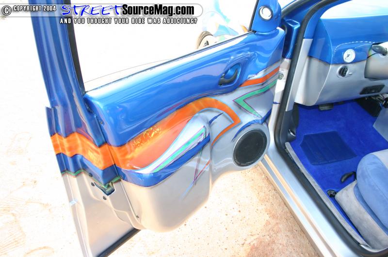 The seats and headliner are wrapped in Miami Suede with the seats being covered in blue and silver and the headliner being wrapped in blue. The suede was laid down by Gary’s Auto Trim in Georgia. The door panels and a panel on the trunk where glassed and then graphed out. Focus Central AC billet knobs set the dash off.
