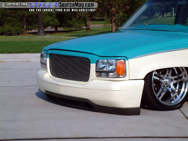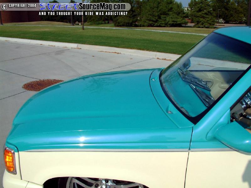 Working over the exterior Mitch would bolt up all new products upfront. For starters a GM hood would take the place of the stock Chevy hood. Next Mitch would install a Denali grille with having modified openings to his liking. The front finders would then be swapped out with a set of Denali fenders with shaved flare holes and with radiused edges. The installation of a GMC Sierra bumper and Denali headlights would help finish up the front transformation.
