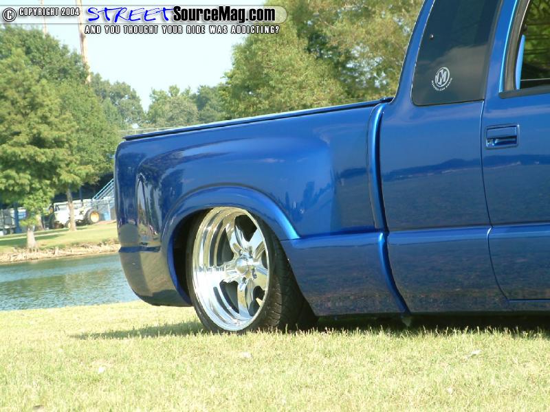 To help get Alan’s S10 down to a respectable level he would have Josh Long at Wicked Kustoms of LaVergne, TN handle the suspension needs. For starters the rear frame rails would be notched along with installing a triangulated Pete & Jakes 4-link. Upfront a set of Belltech drop spindles would be installed. Firestone 2600 airbags would then be positioned at all 4 corners for adjustability.  Helping provide the air to the bags Alan would have Josh install a 12 gallon Air Lift air tank, ½ inch SMC valves for the up with 3/8’s inch SMC valves for the down. An Air Lift engine driven compressor keeps the air tank filled with air. When aired out the fenders would now tuck the 18x8 Centerline Daggers wrapped in 225 40ZR18’s upfront and 265 35ZR18’s Kumho’s in the rear.