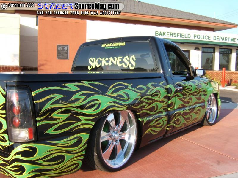 The first thing that draws your attention is the awesome tribal flame paint job that covers every inch of the exterior. All using House of Kolor paints, Kyle from world famous K-Daddyz Kustoms in Bakersfield, Ca., takes the honors for this marvelous piece of rolling machinery.   With pride, he leaves his signature on the tailgate of the truck which just completes the custom job.