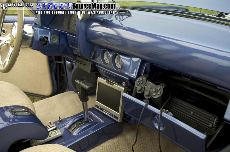Moving on into the interior you’ll find the same heavily mod’d surroundings. You’ll first see a Billet Specialties steering wheel in front of the painted and smoothed dash. Found molded into the dash would be a set of air gauge pods along with a custom fiberglass center console.