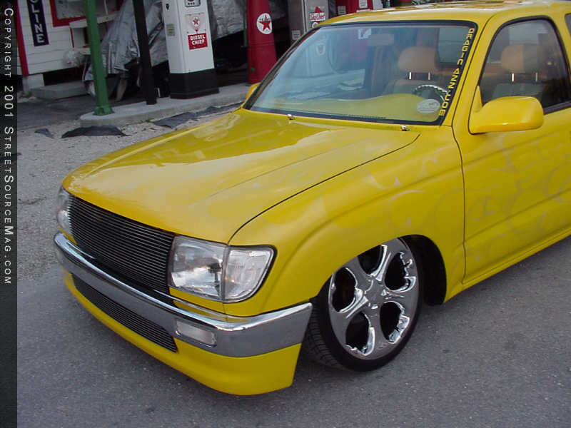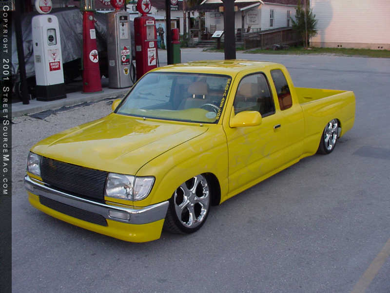 Then they bent custom tubing and created one-off mounts for the Firestone 2600lb airbags in the rear of Stephen's Taco. Next, the Draggin Azz crew ditched the rear leaf springs and replaced them with a chrome triangulated 4-link from TCI. In the front, a custom cross member was built and Firestone 2500lb airbags were installed. To smooth the Taco's adjustable ride out, Doestch Tech shocks were installed in the front and rear. Finally, to allow Stephen's Taco to go from railing status to driving-height status, electric fast valves were installed.