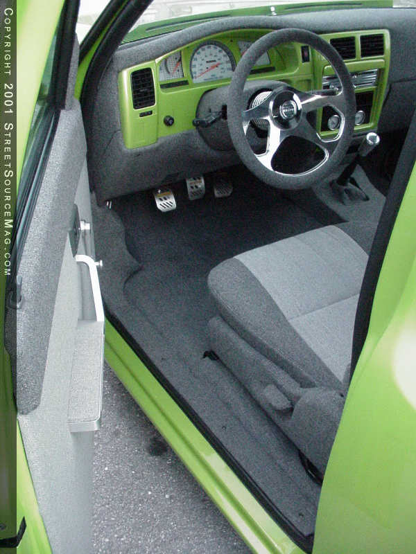 Since Jason drives his beauty to shows, it was a must to install something to listen to on the long hauls to shows. Jason called the guys at N2 Audio for help with this matter. Starting with the head-unit, a JVC Kameleon CD player was mounted in the dash. In the doors, Diamond Audio mids and tweets were installed, and Kicker Solobaric SQ. 8 subs were installed for the boom. Kicker amps power the whole system. Under the hood Jason's factory four-cylinder engine is complimented by a polish Sportruck Specialties air intake system with K&N air filter. Jason also installed Cool Flex polished hoses and several billet cap accessories. To clean up the engine compartment, the battery was removed and moved under the truck on the passenger's side.