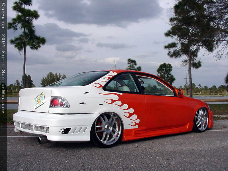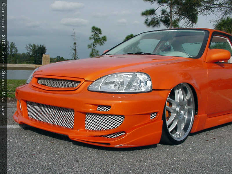 The crew at Fitzpatrick's also shaved the door handles and smoothed the front fenders and hood. In the front of Nathan's Civic you'll also find a Wings West bumper and custom headlights as well as a rear bumper from Wings West.   After the final sanding and prep work was complete, Fitzpatrick's sprayed the car white, then added a truly one-off House Of Kolor Tangelo Orange Pearl across the front of Nathan's Civic, which breaks into a flame-style graphic, separating the two colors.