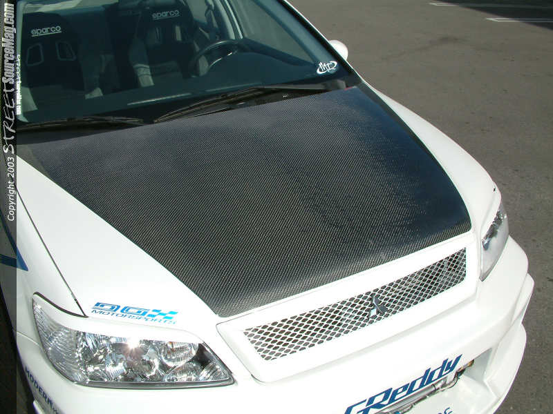 Keeping things on the clean side and fairly simple, a DG Motorsports Carbon Fiber Hood with Evo VII Grille shell would be bolted up. Next a Ken Style front and rear bumper would replace the stock bumpers while a set of eyelids, mirrors and Evo VII wing would all be bolted up to give the Lancer a more aggressive appeal.