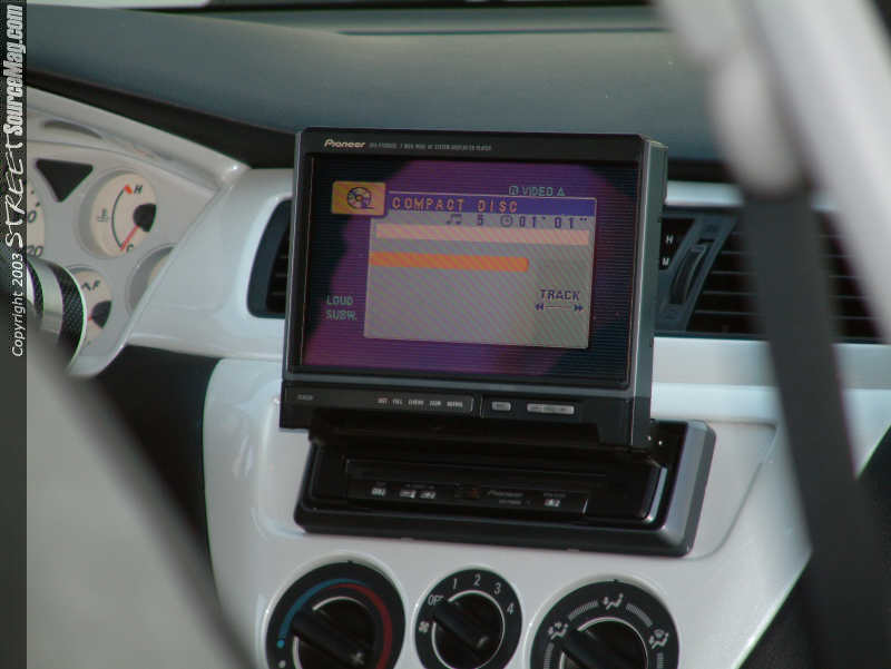 The rear deck was done in black and gray suede material with 6.5's and tweeters in the deck stock location. You can also find 2 12-inch Pioneer subs fiber-glassed in the along with a set of 2 channel and 4 channel Pioneer amplifiers.   Finishing things off inside you will find a Pioneer CD/TV/Tuner wired by Scosche, while Audio Options performed the trunk work.